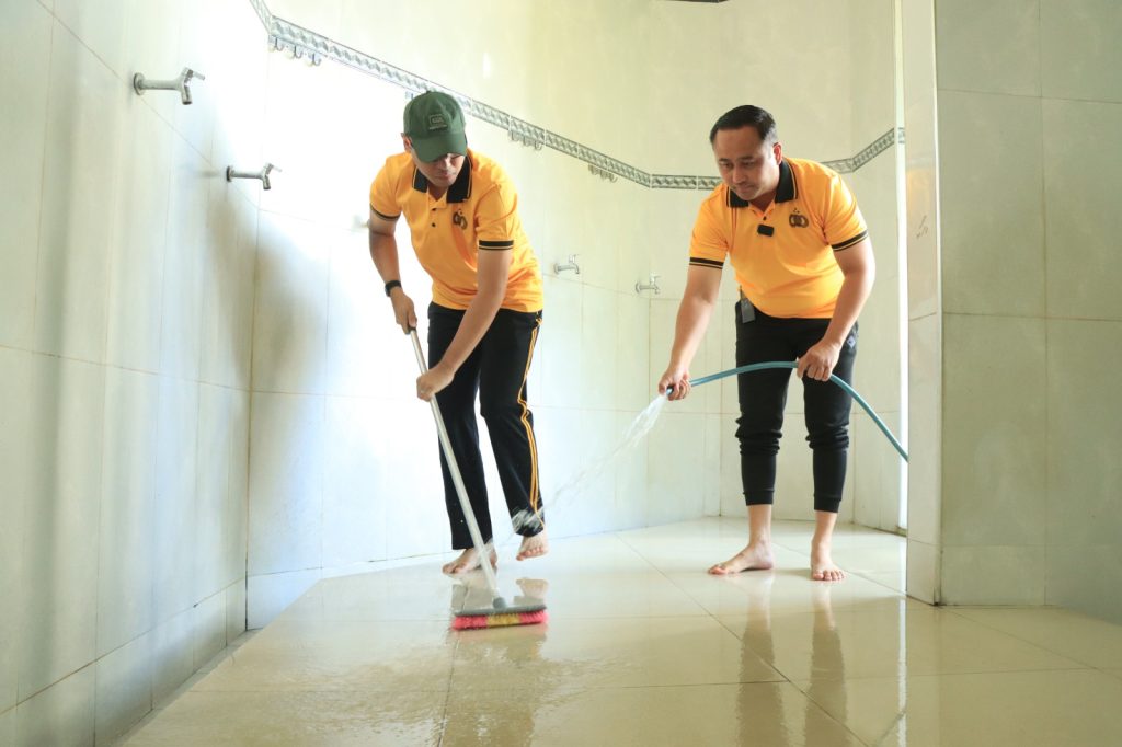 Arahan tersebut disambut antusias oleh anggota yang langsung bergerak sesuai ploting tugas masing-masing. Suasana kebersamaan tampak jelas saat personel bahu-membahu menyapu halaman, mengepel lantai, membersihkan kaca, hingga merapikan fasilitas umum demi memastikan lingkungan tempat ibadah tetap terjaga kebersihannya.