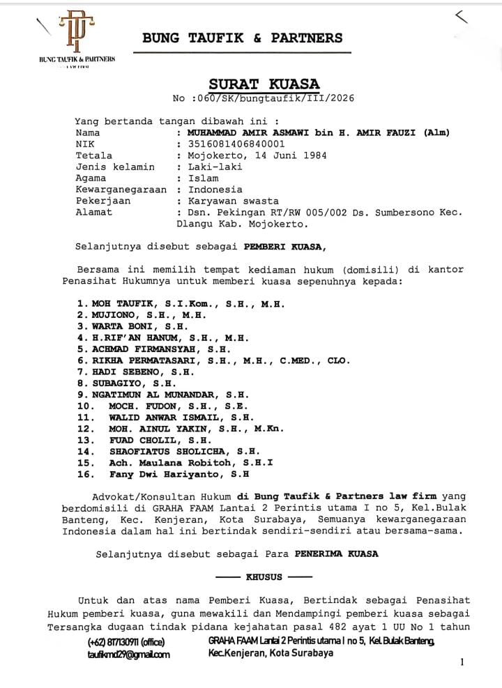 Jawa Timur | Beritakarya.com – Kepastian hukum terkait pendampingan perkara yang melibatkan Muhammad Amir Asmawi akhirnya menemui kejelasan. Surat kuasa bernomor 06/SK/bungtoufik/III/2026 telah ditandatangani secara sah, sehingga mandat resmi kini berada di tangan tim kuasa hukum yang dipimpin Bung Taufik, Rabu (25/3/2026).